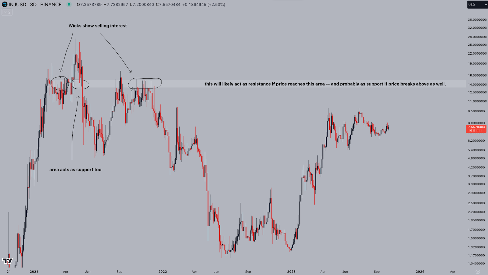 為了辨識報酬的點位,我們必須回顧先前的價格走勢,找出價格盤整或難以突破的區間。以 INJ 為例,這個區間既是支撐又是阻力,取決於價格是從上方或從下方測試該區間。根據過去價格在此區間掙扎、難以突破來觀察,我們可以合理地假設,它將再次成為一個相關區間。