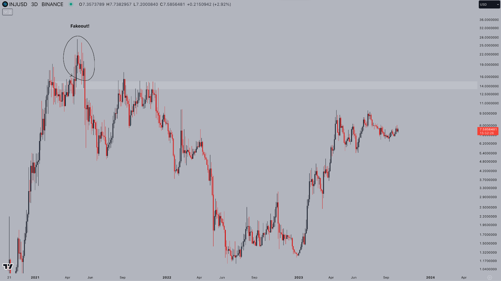 事實上,我們剛才探討過的同一張 INJ 圖表,正顯示了其中一個假突破的狀況。如你所見,價格短暫突破了我們認定的點位,但很快又回落到點位之下。隨後出現了一波強勢抛售。當價格突破某個點位,但隨後迅速回撤,並再次回歸該點位時,請保持謹慎。
