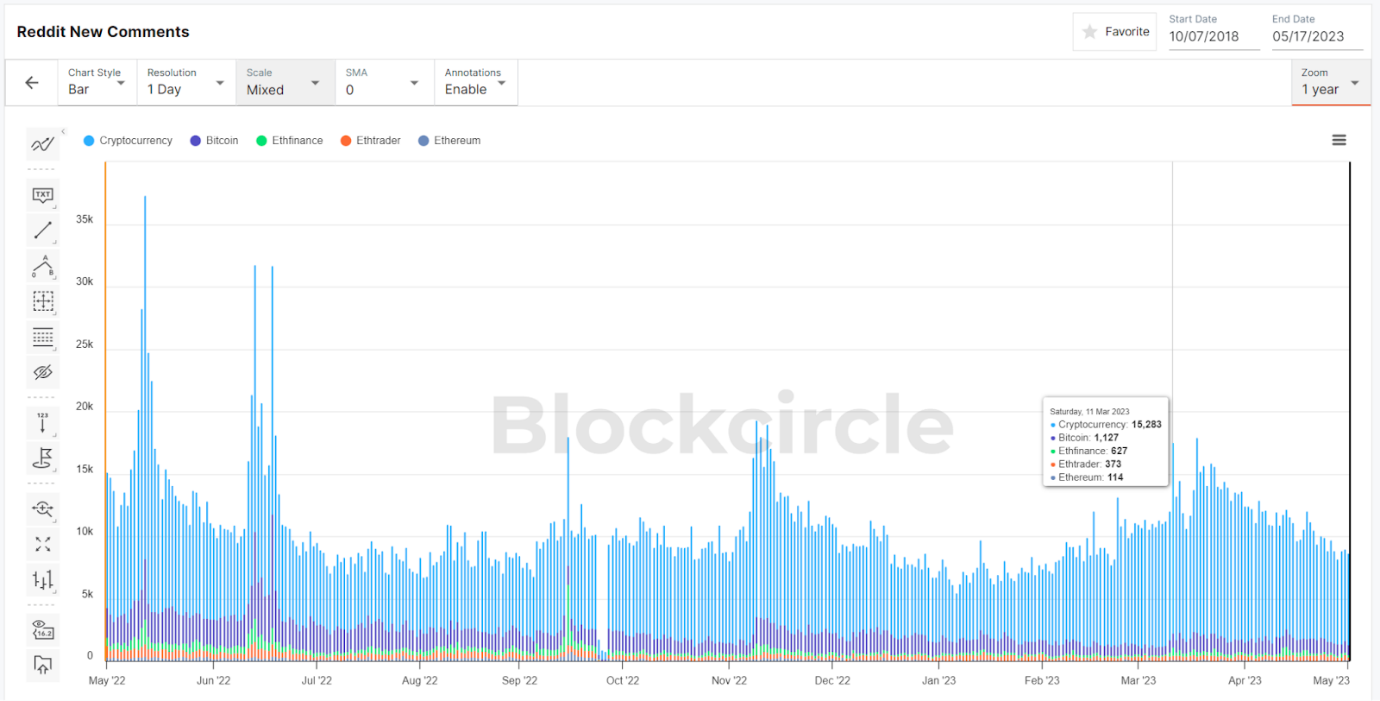 舉例來說,我密切追蹤和監測 Reddit 的新評論(見圖 2),因為它是投資者情緒的良好徵兆。通常情況下,你會發現 Reddit 評論數量的上升與特定資產的潛在興趣上升有非常強的直接相關性,進而導致該資產價格上漲,反之亦然。