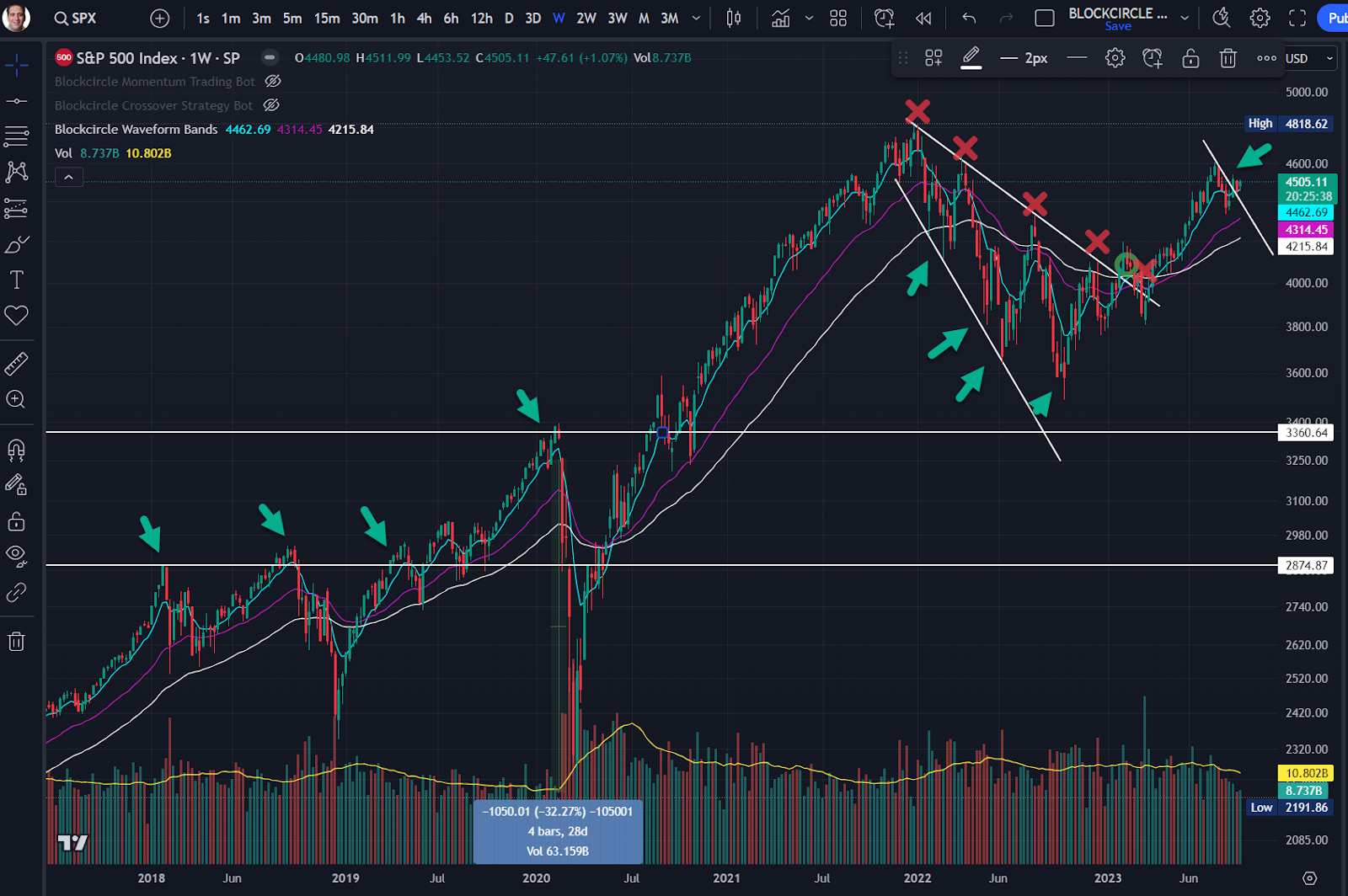 步驟 2)接著我會衡量 S&P 500 的圖示以了解股票市場的運作方向。儘管一些山寨幣投資者和比特幣主義者多麼盲目地看好加密資產,但密切關注傳統市場絕對至關重要。因為它們的總價值超過 60 兆美元,而加密貨幣總體仍然只值 1 兆美元。