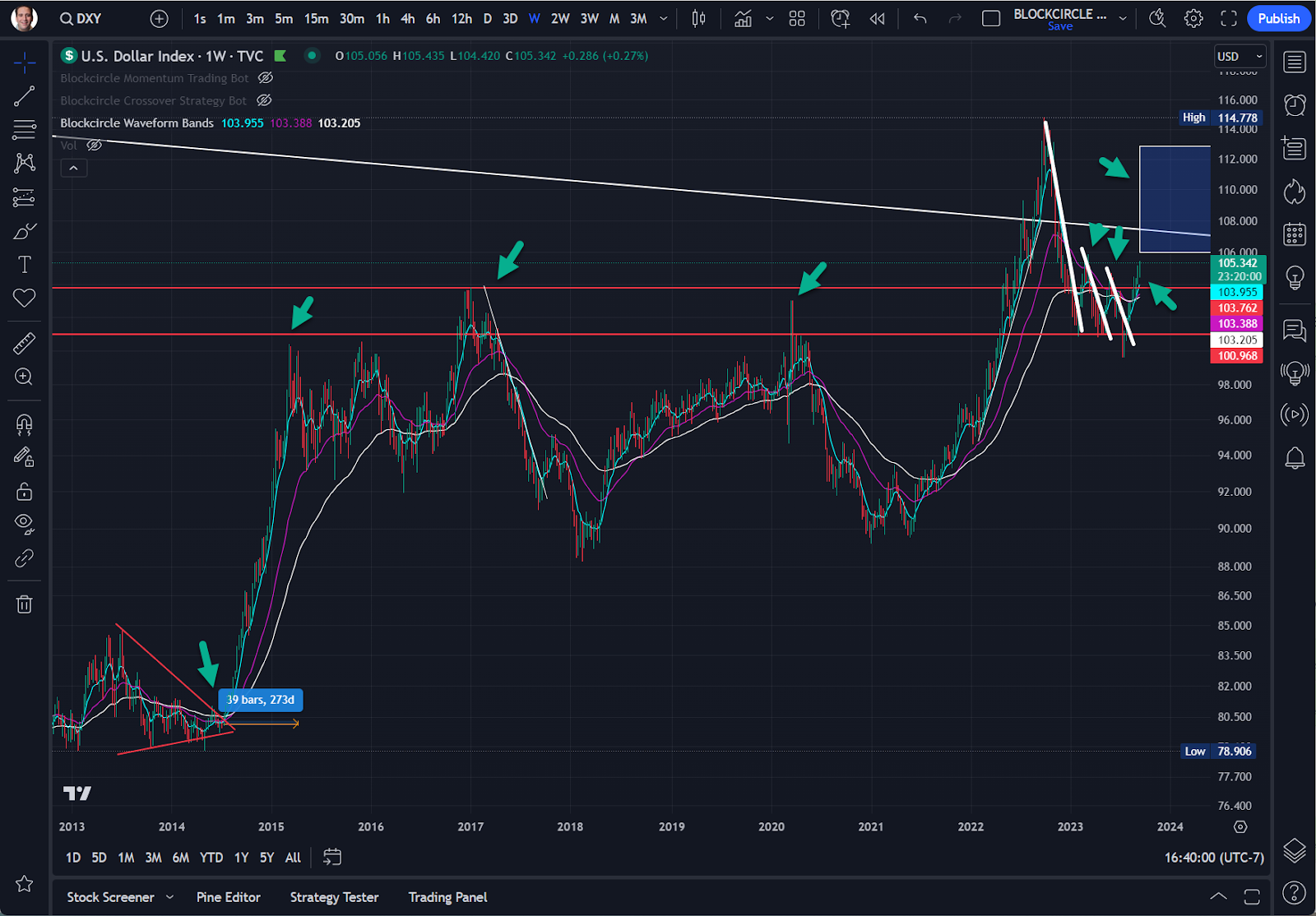 步驟 3)接著,我會按週和月的時間跨度查看 DXY 圖表。這對我來說是一個重要的追蹤指標,因為它在衡量資產風險表現方面顯示出一定的能力。