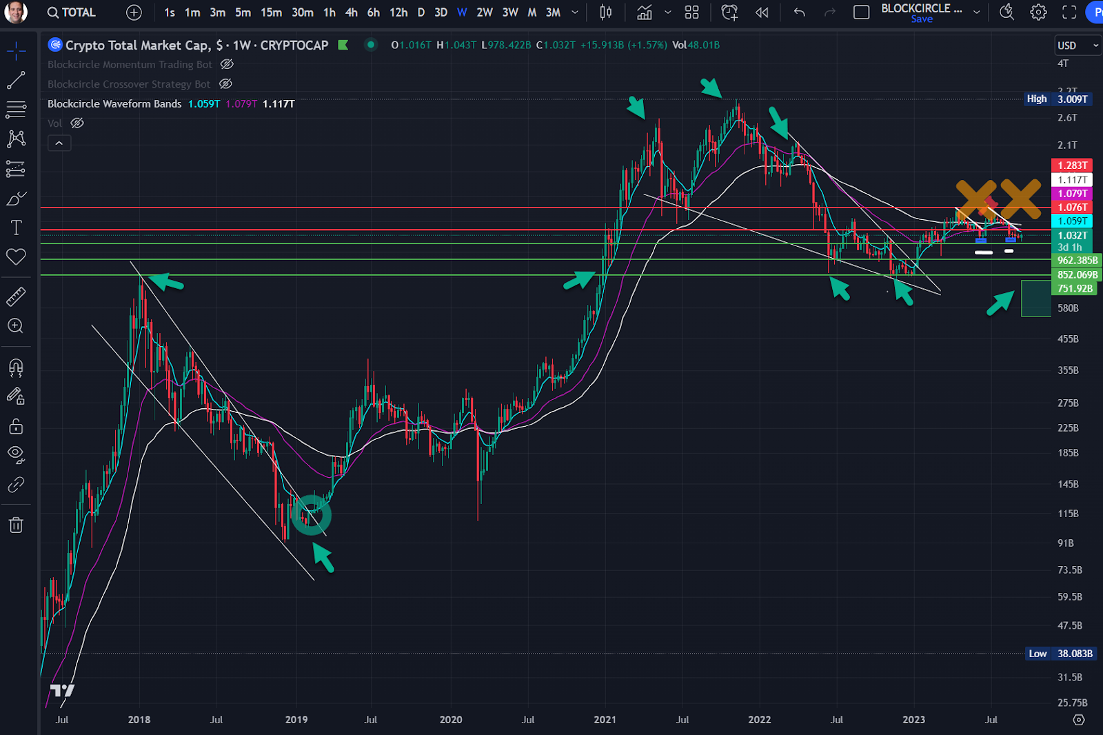 步驟 1)首先我會看加密資產板塊的總市值。我喜歡仔細觀察歷史支撐位和阻力位,並根據目前過去 24 小時的價格歷史,看看我們是否正在接近其中任何一個支撐位和阻力位。我傾向於從 1 個月,然後是 1 週,最後是 1 天的時間維度來理解這個特定觀點。這種自上而下的結構可以讓我始終從同一個點出發,讓我在衡量市場牛熊時不會產生隱含的偏差。