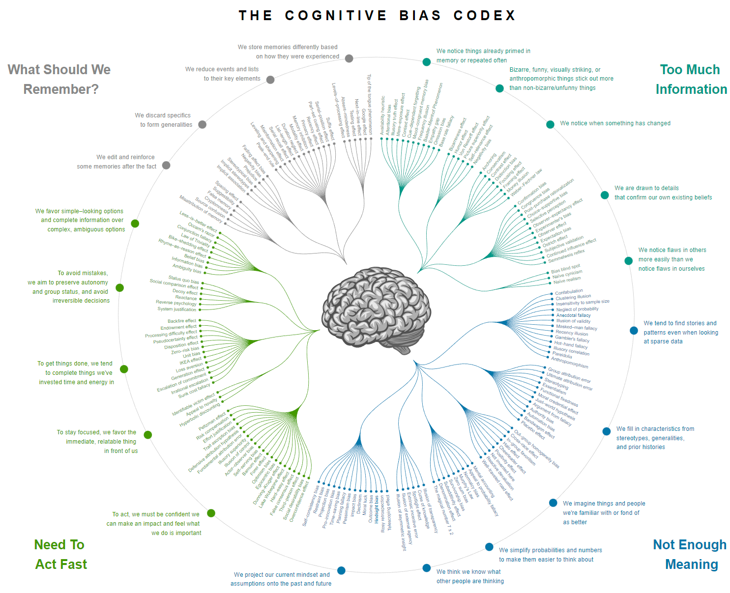 我已經概述了為什麼加密市場的高速節奏需要交易者具備快速、準確的決策技能的同時,也要遵守明確的交易計劃。確認偏差和錨定等認知偏差會阻礙有效決策,因此我建議交易者必須積極挑戰自己的假設,並尋求不同的資訊來源來抵消這些偏差。以下是一個有用的視覺化工具,它以有意義的方式組織偏差,幫助你立即識別一些阻礙你發揮交易潛能的認知偏差。